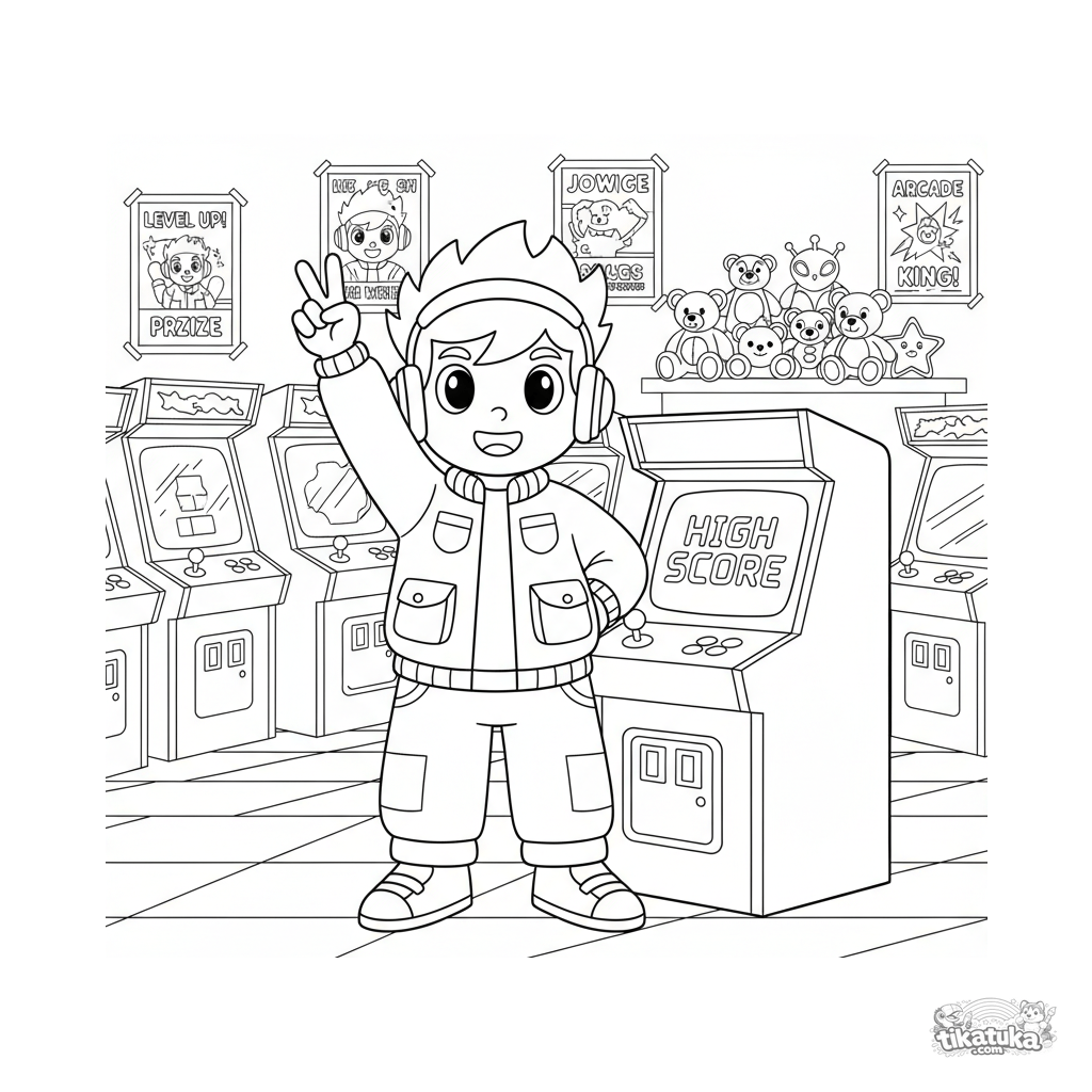 Página para colorir para crianças mais velhas: um jogador retro comemora uma pontuação alta em uma sala de fliperama cheia de máquinas e pôsteres. Cena detalhada para colorir.
