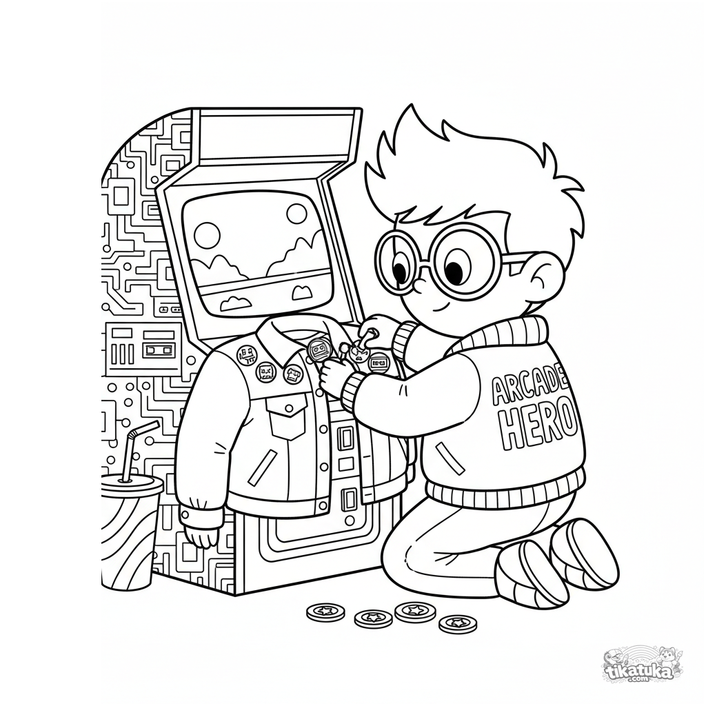 Página para colorir para crianças de 7 a 12 anos: um jogador retro em uma sala de fliperama organizando uma coleção de pins de esmalte. Cena detalhada com máquinas de jogo e acessórios.