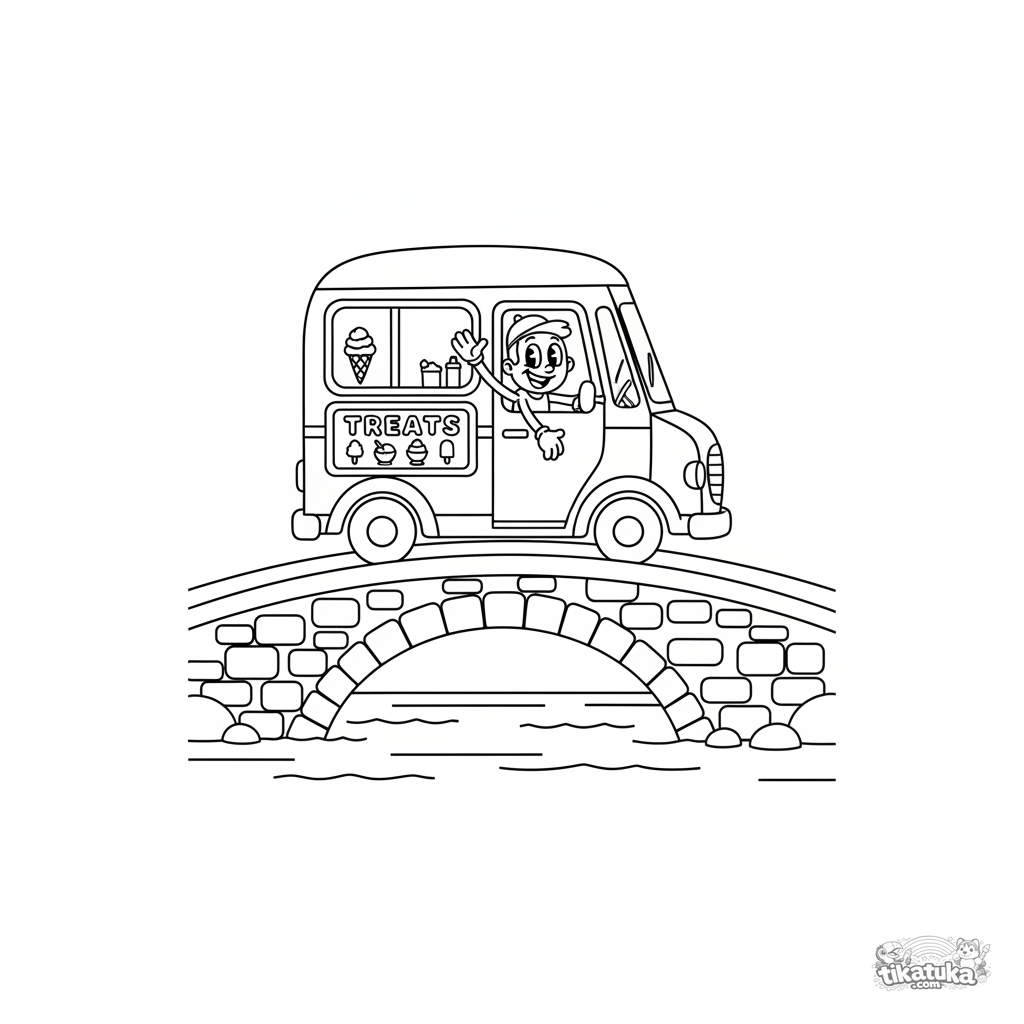 Página para colorir para bebês: um caminhão de sorvete vintage alegre dirige em uma ponte sobre um grande rio.