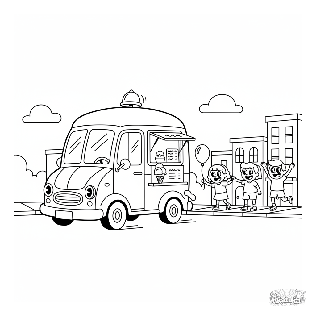 Página para colorir para crianças: um caminhão de sorvete retrô dirigindo por uma rua da cidade. Para meninos de 4-6 anos.