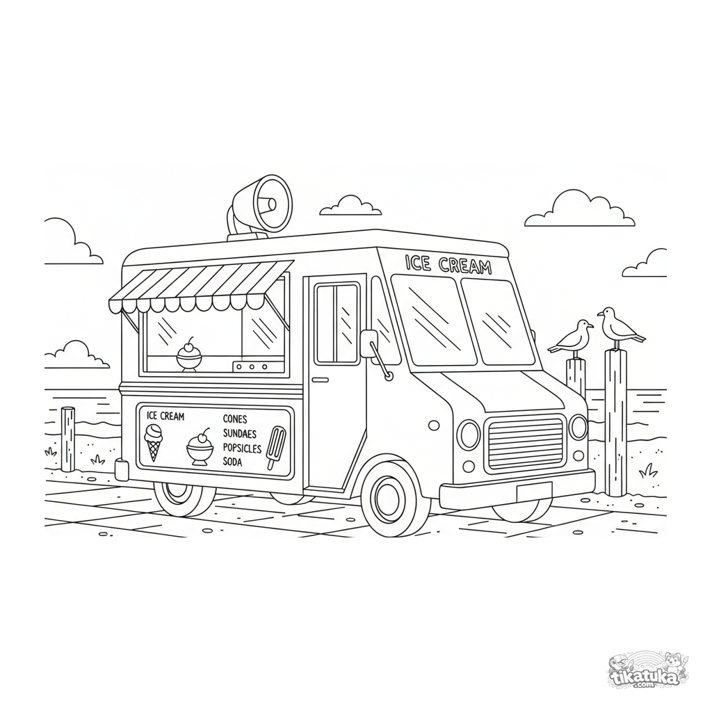 Página para colorir para meninos com um caminhão de sorvete retro em um calçadão de praia ensolarado. Cena detalhada mas clara para crianças de 4 a 6 anos.