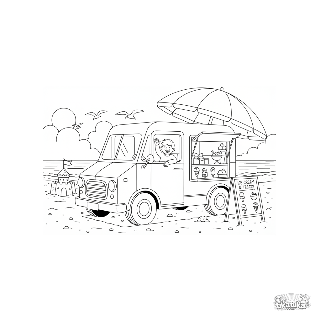 Página para colorir para meninos de 4 a 6 anos. Um caminhão de sorvete vintage está estacionado na areia sob um grande guarda-sol de praia. Cena de verão e detalhada.