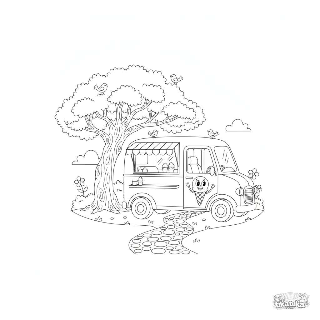 Página para colorir para meninos de 4-6 anos: um charmoso caminhão de sorvete retro espera por clientes sob uma grande árvore. Veículo detalhado para colorir.