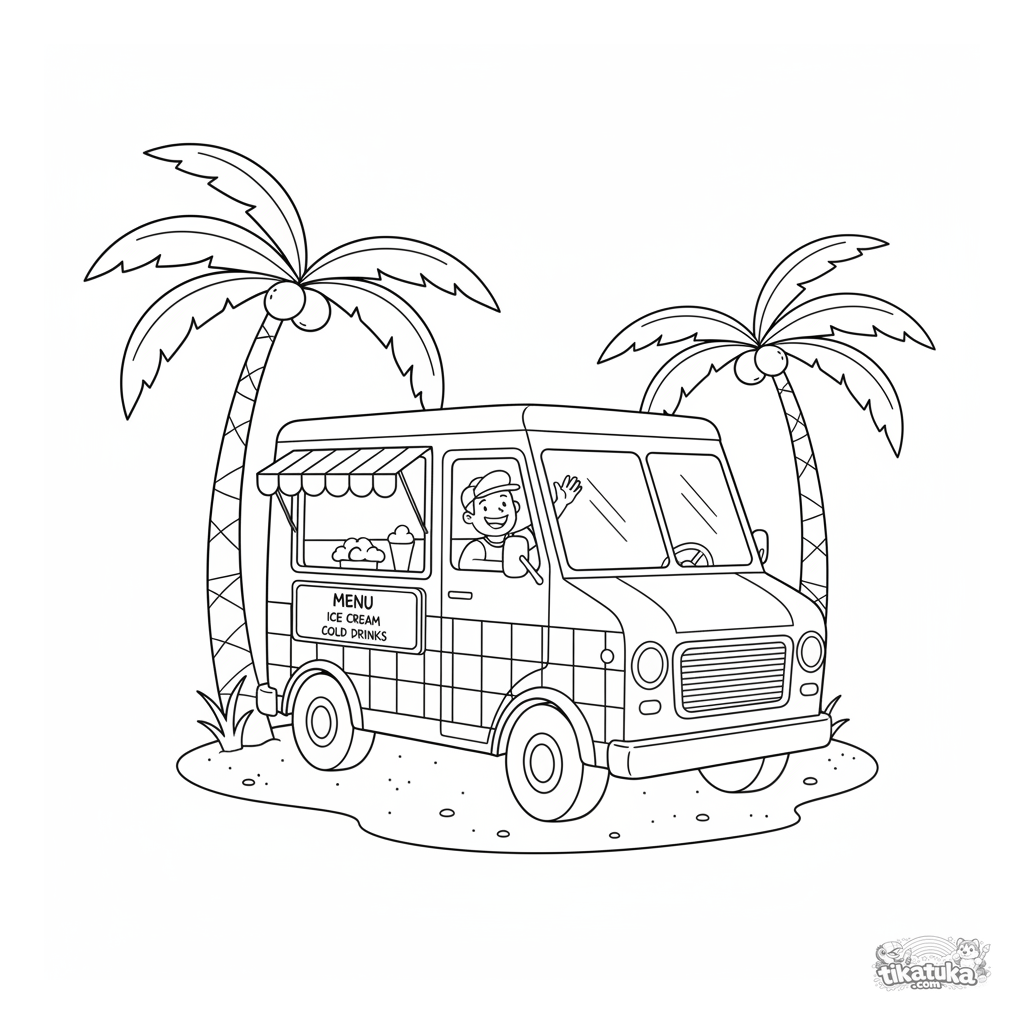 Página para colorir para meninos de 4-6 anos: um caminhão de sorvete retrô xadrez estacionado sob coqueiros. Cena de veículo detalhada.