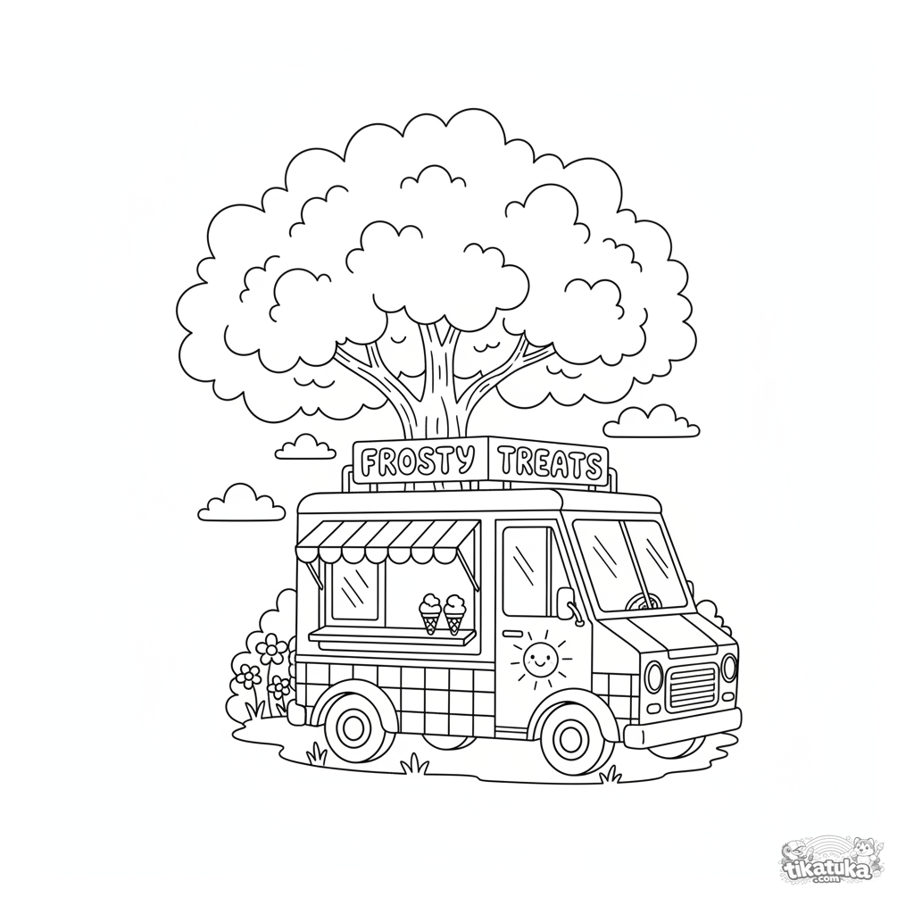 Página para colorir para meninos de 4-6 anos: um caminhão de sorvete vintage com padrão xadrez estacionado sob uma grande árvore. Contornos claros e detalhes reconhecíveis.