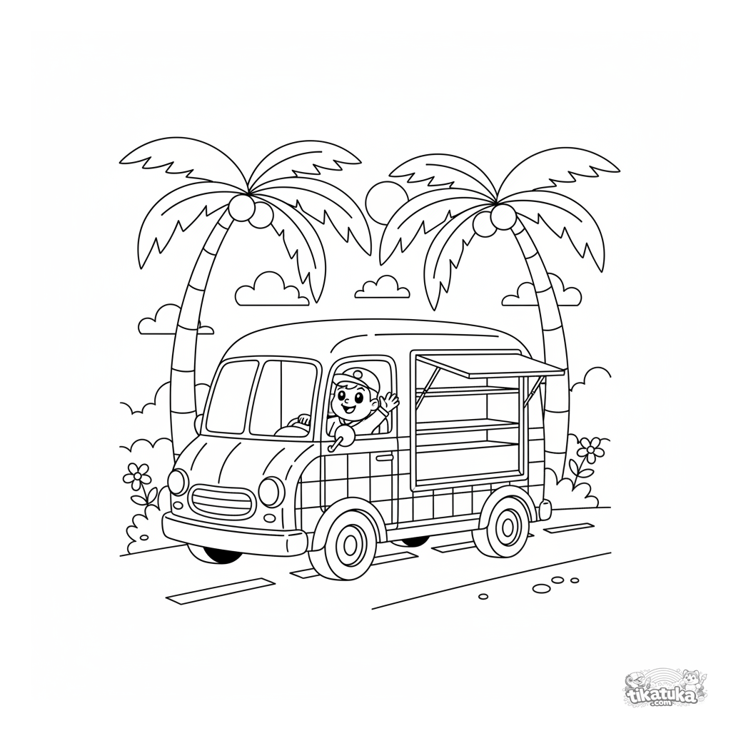 Página para colorir de um caminhão de sorvete retrô estacionado sob coqueiros. Para meninos de 4 a 6 anos.