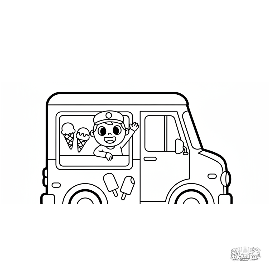 Página muito simples para colorir para crianças pequenas de 2-3 anos: um caminhão de sorvete retro com motorista sorridente. Formas grandes, detalhes mínimos.