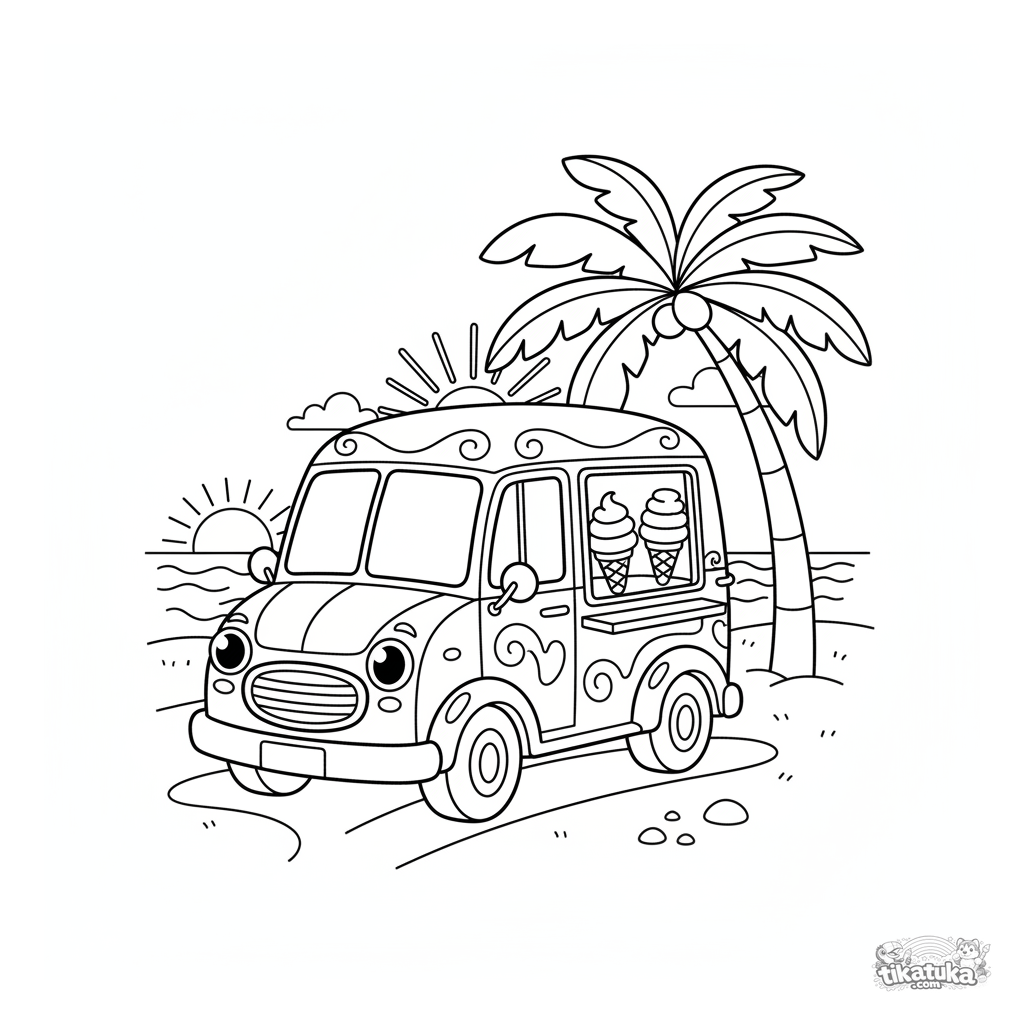 Página para colorir para meninos 4-6: um caminhão alegre de sorvete retro com padrões de redemoinho está estacionado sob uma palmeira em uma estrada de praia arenosa.