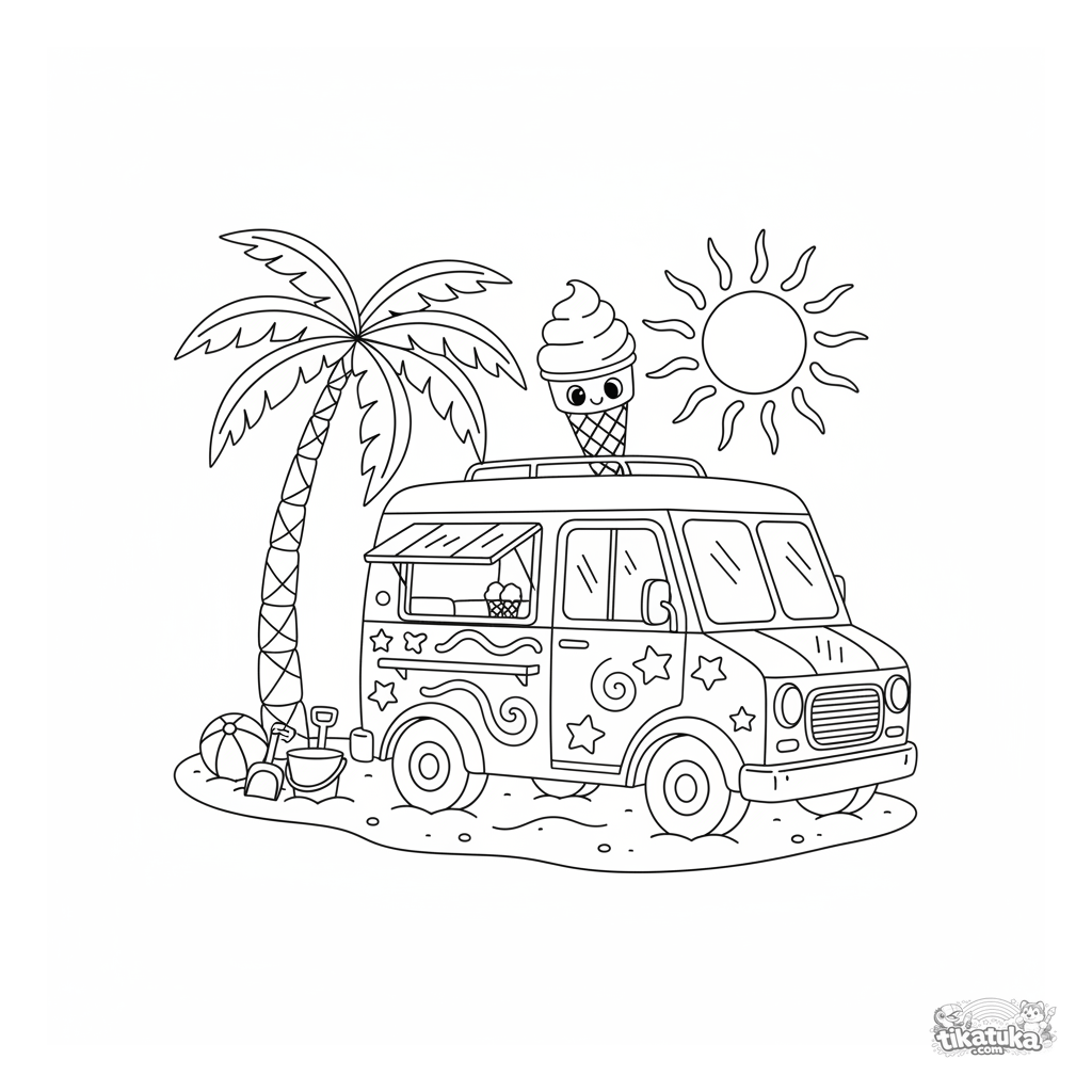 Página para colorir para meninos de 4-6 anos: um caminhão de sorvete retrô alegre estacionado na praia sob uma palmeira.