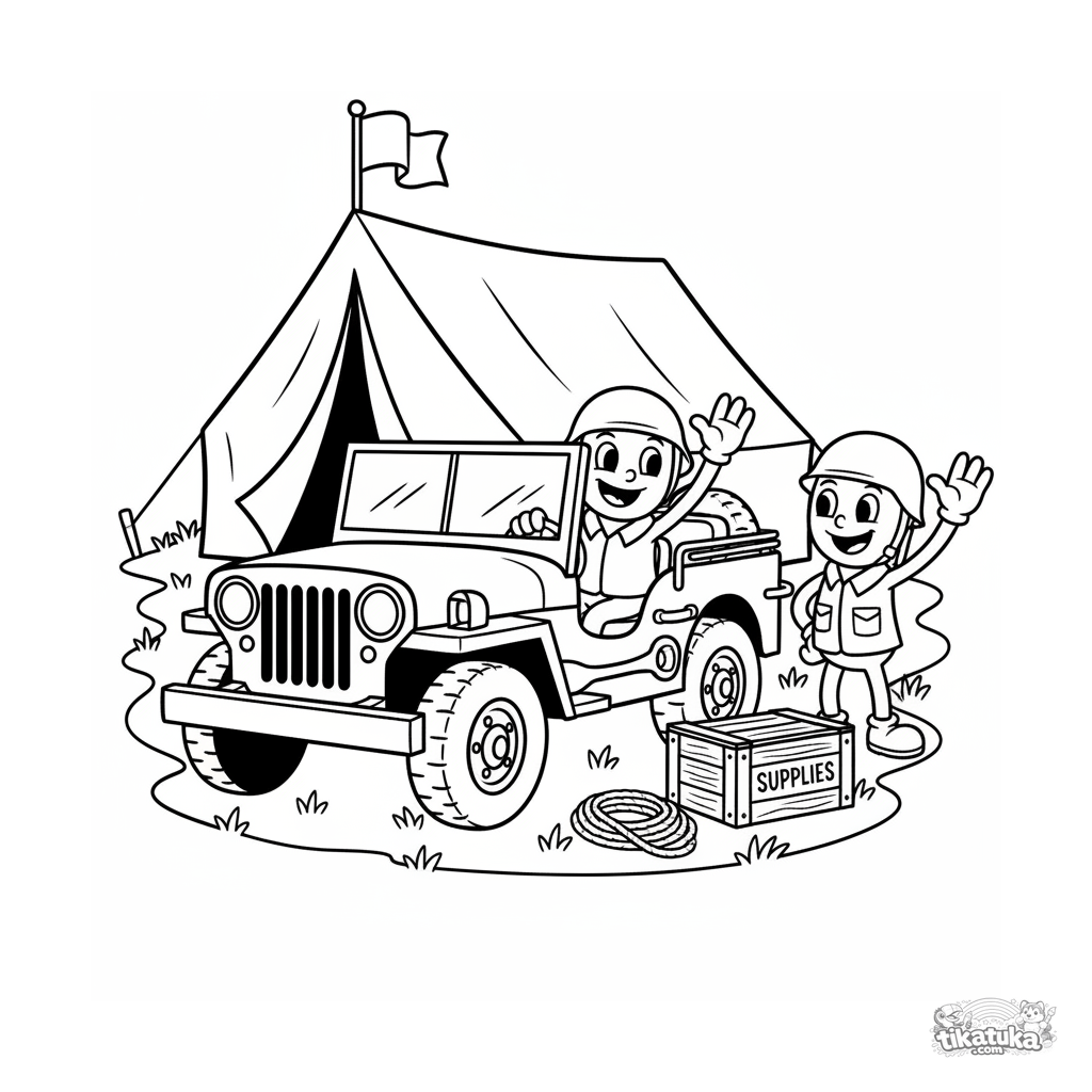 Página para colorir para crianças de 4-6 anos: um jipe militar vintage estacionado perto de uma barraca de QG de campo. Um motorista alegre acena.