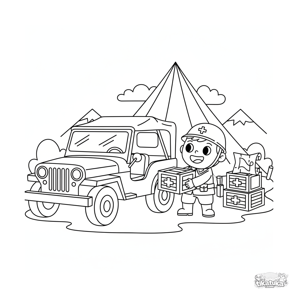 Página para colorir para crianças de 4-6 anos: um jipe militar vintage descarregando caixas de suprimentos perto de um quartel-general de campo com barracas.