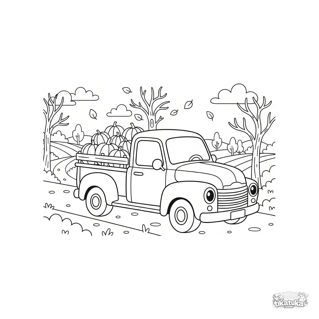 Página para colorir para meninos 4-6: uma caminhonete vintage carrega abóboras por uma estrada de outono. Cena vibrante mas não muito detalhada.