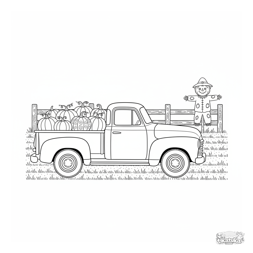 Página para colorir detalhada para meninos 7-12: uma caminhonete vintage desenhada com detalhes, carregada de abóboras, num campo de fazenda. Estilo realista.