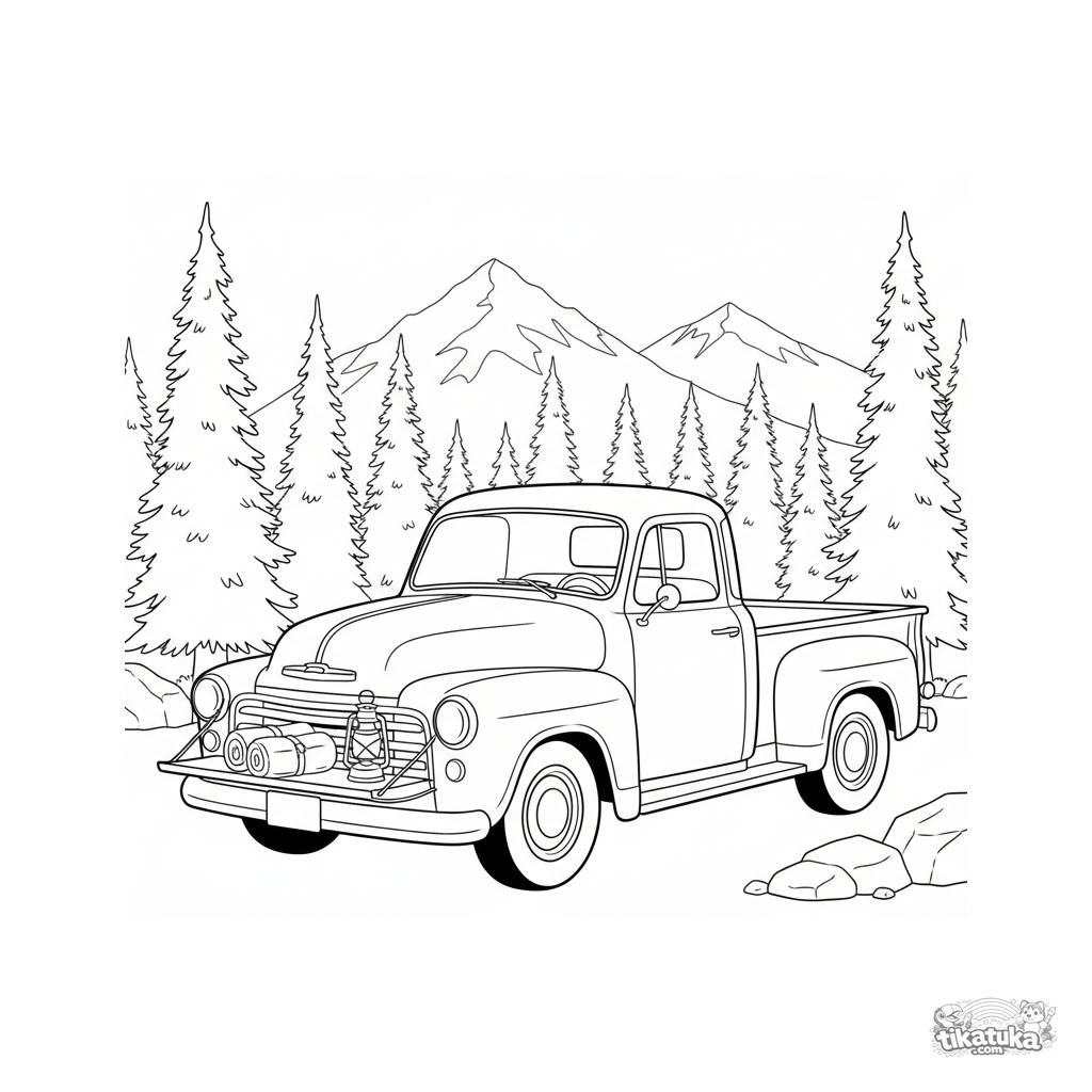 Página para colorir de uma caminhonete retro estacionada em um acampamento de montanha ao anoitecer. Para meninos de 4 a 6 anos.
