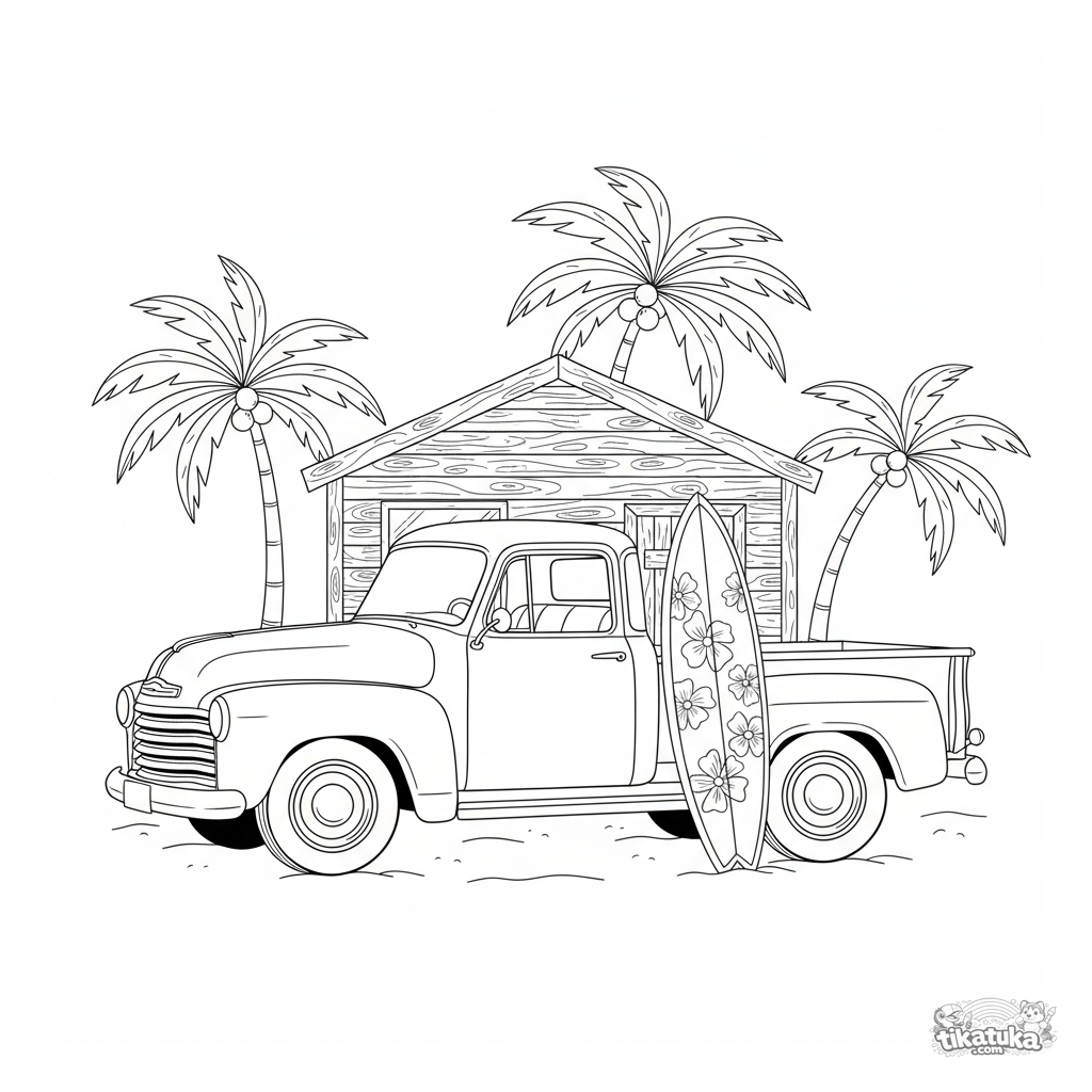 Página detalhada para colorir para meninos de 7-12 anos: uma caminhonete retrô em estilo realista está estacionada em uma barraca de praia com uma prancha de surf. Muitos elementos para colorir com cuidado.