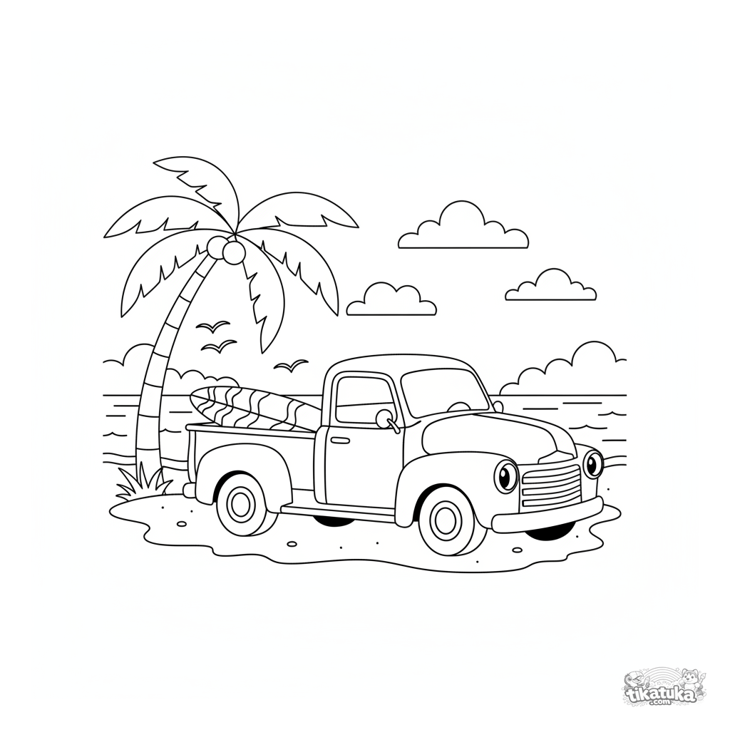 Página para colorir de uma caminhonete retrô dos anos 50 na praia. Para meninos de 4 a 6 anos. A caminhonete tem um rosto amigável, uma prancha de surfe na caçamba e um coqueiro ao fundo.