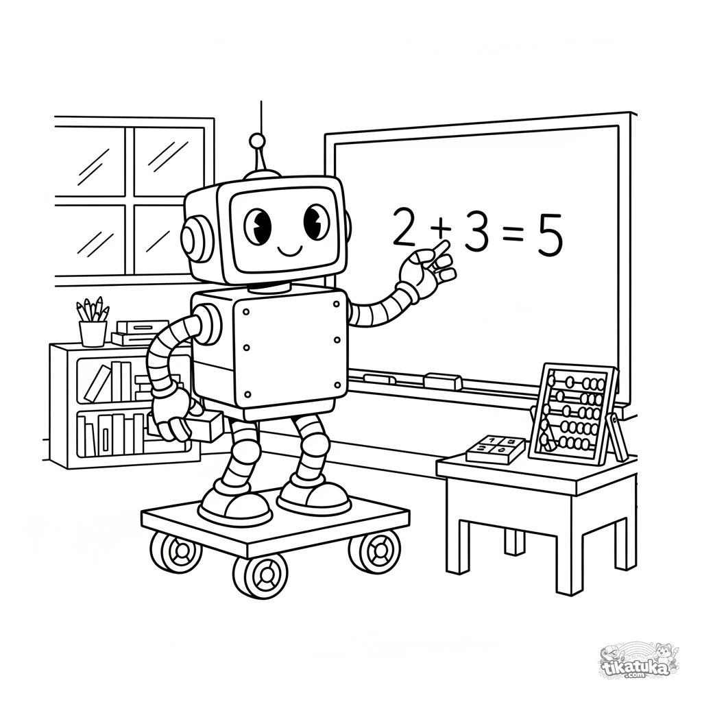 Página para colorir para 7-9 anos: um robô retrô assistente escreve uma equação matemática com giz no quadro da escola. Estilo de desenho antigo, ábaco e tabela numérica.