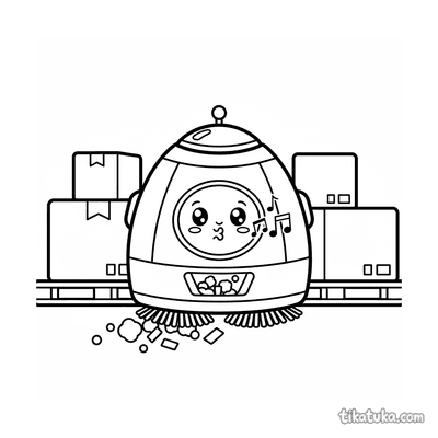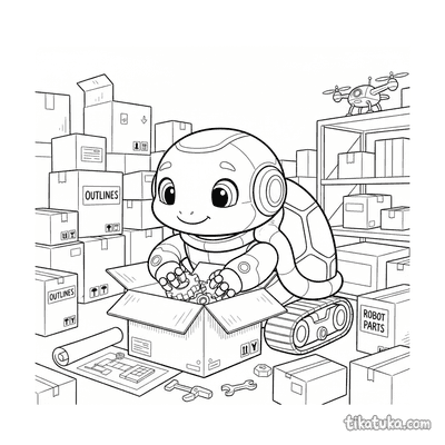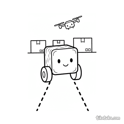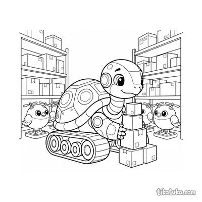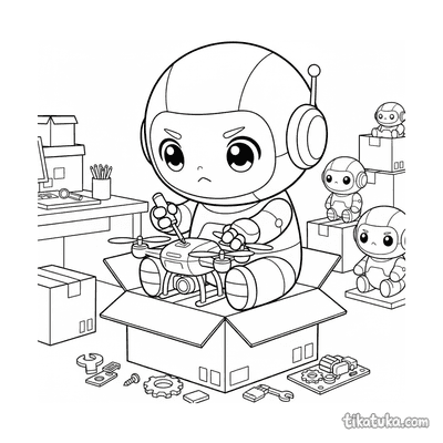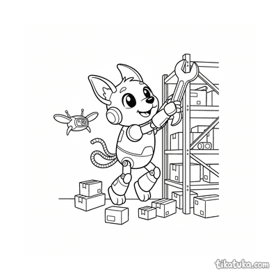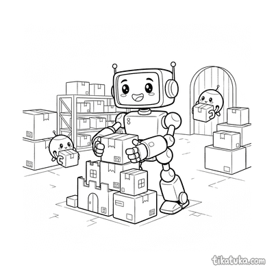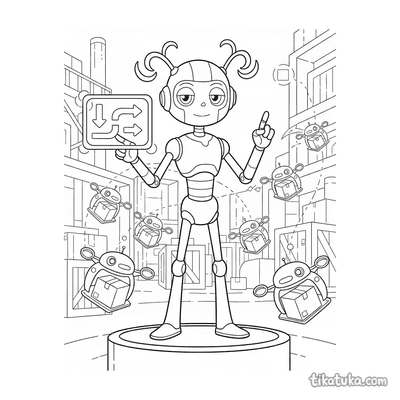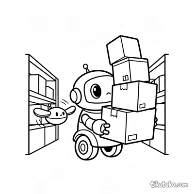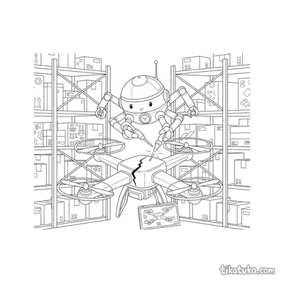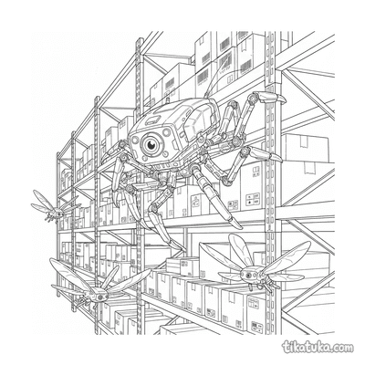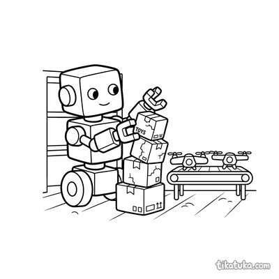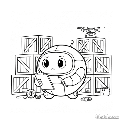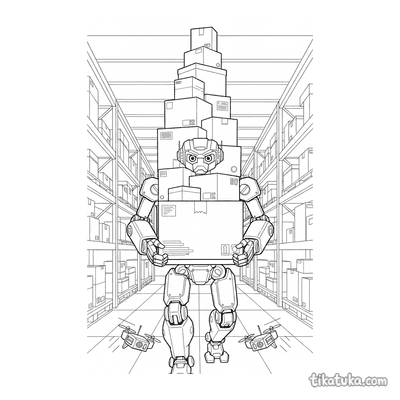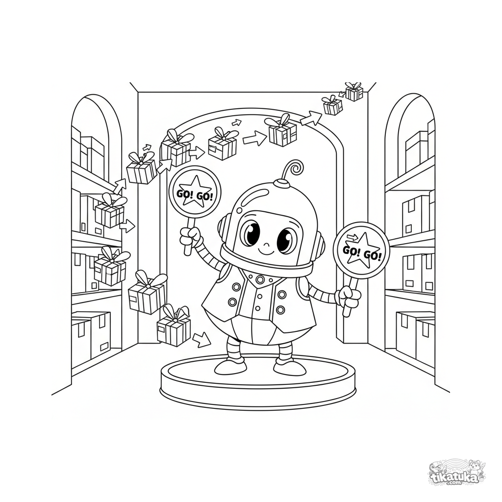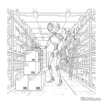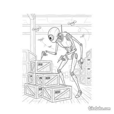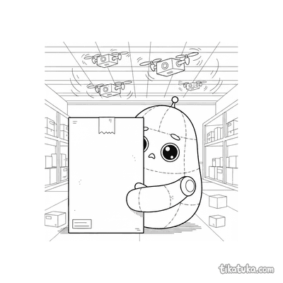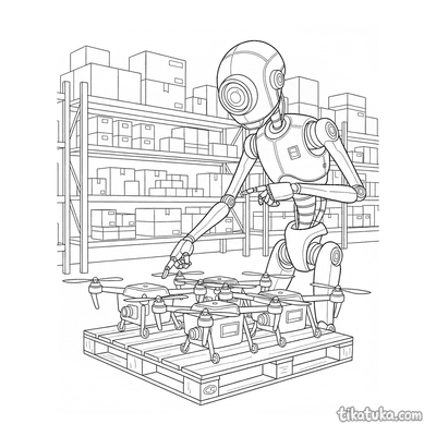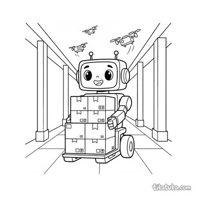 Página para colorir para 7-9 anos: um robô retro desajeitado com colete direciona um fluxo de drones carregando pacotes voando por um corredor de armazém usando placas luminosas.