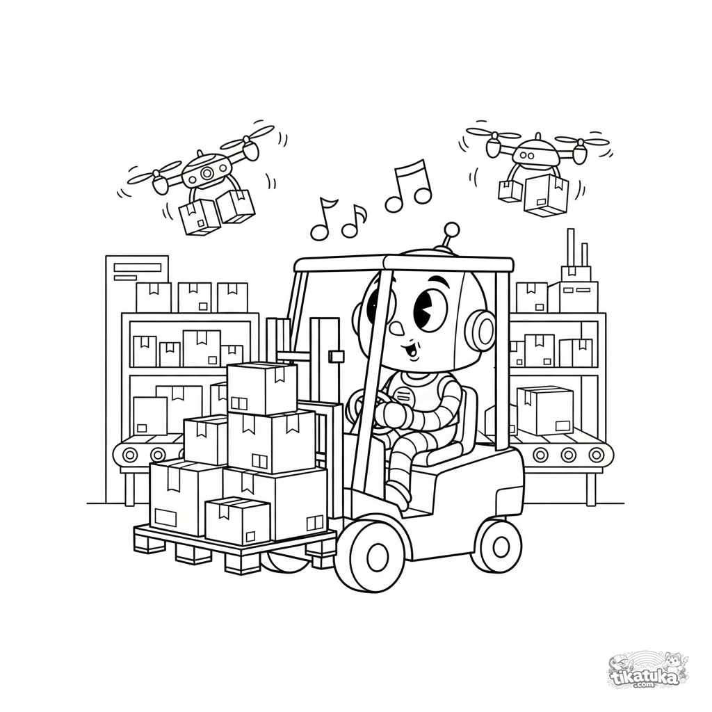 Página para colorir para crianças 4-6: um robô retro alegre no estilo de desenho antigo operando uma empilhadeira em um armazém. Personagem brilhante e amigável, fundo simples.