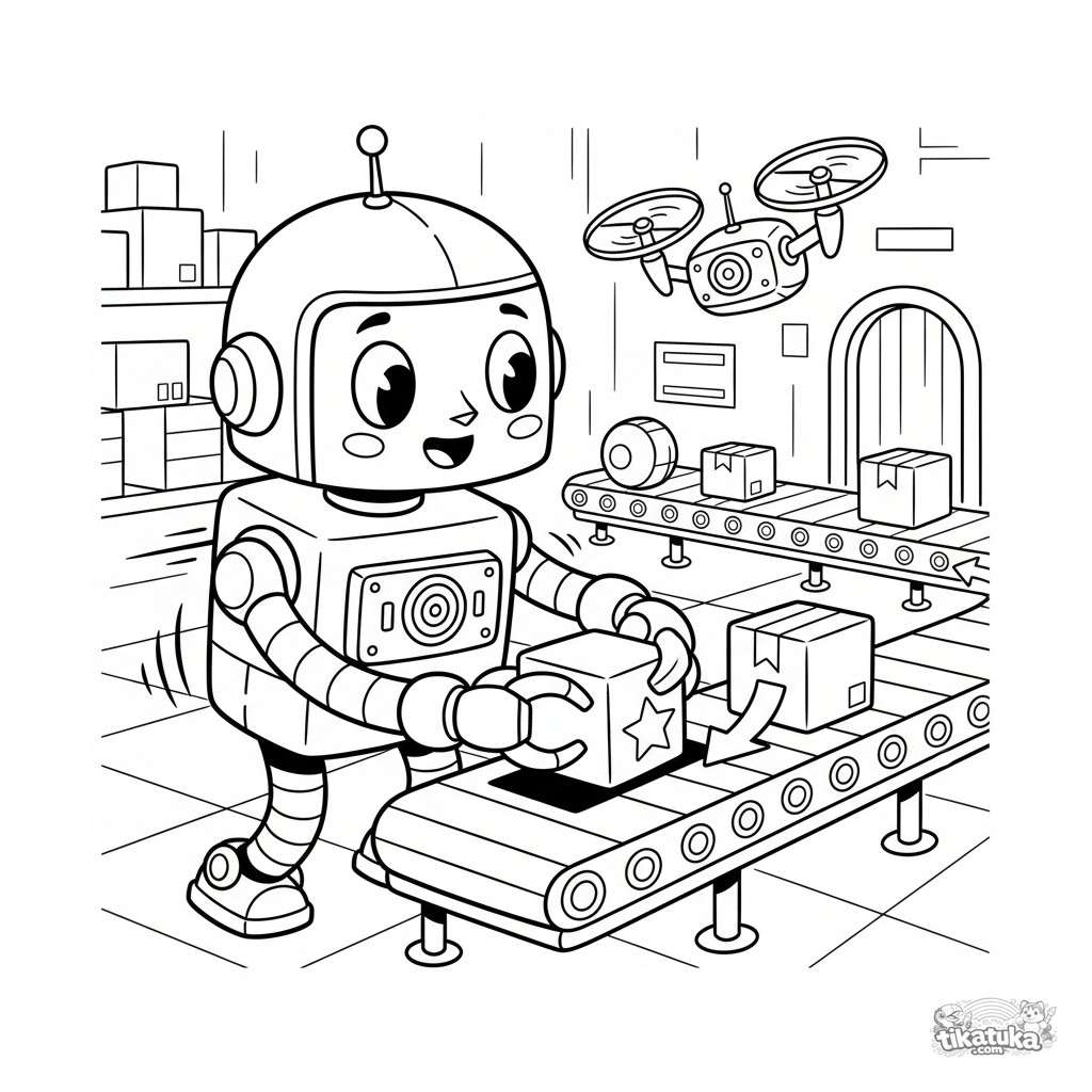 Página para colorir para pré-adolescentes 7-9: um robô estilo retro com cabeça de cúpula classifica pacotes em uma esteira rolante de armazém. Um drone ao fundo.