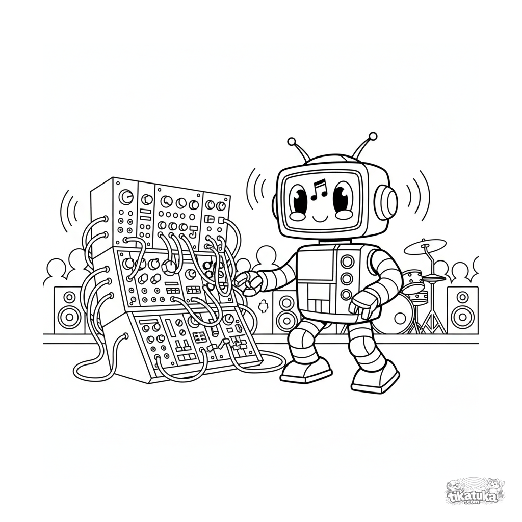 Página para colorir para 7-9 anos: um robô retro toca um grande sintetizador modular em um palco de concerto. Estilo dinâmico dos anos 80.