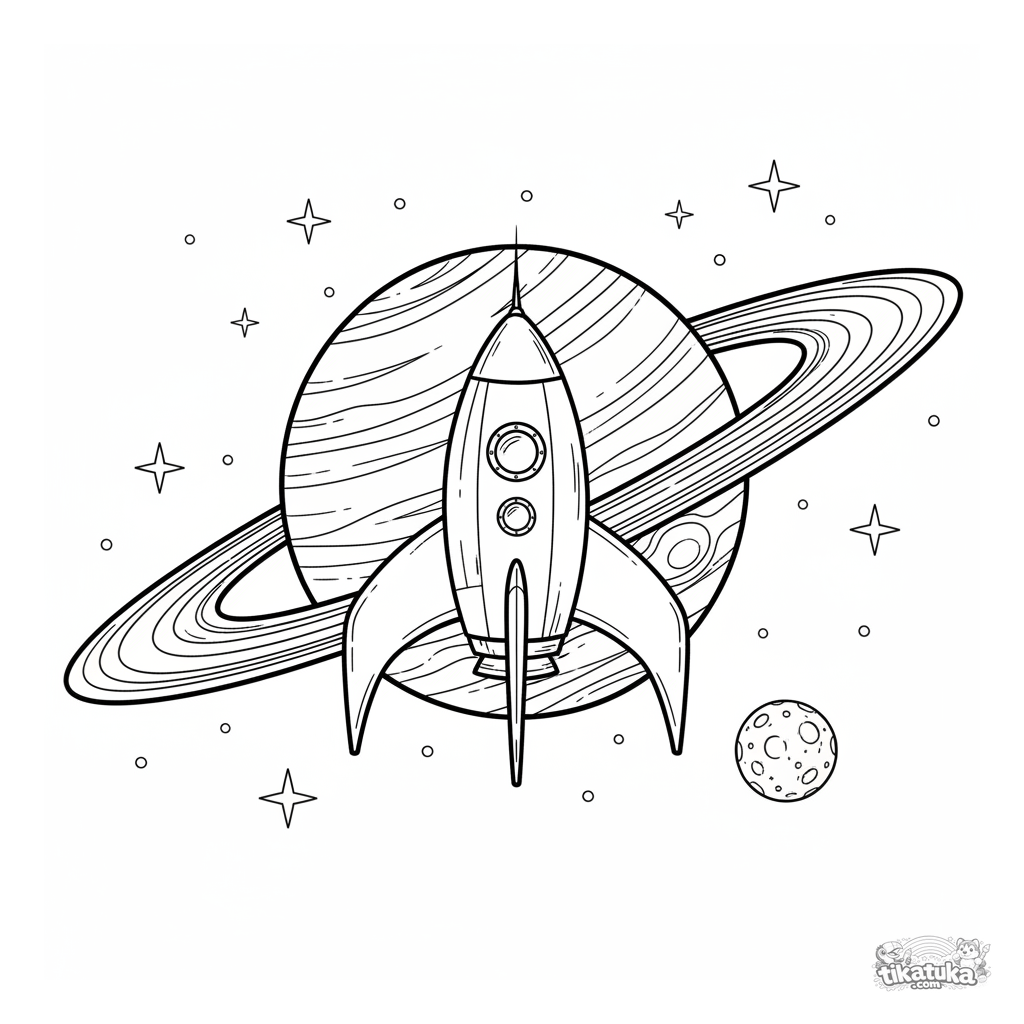 Página para colorir de um foguete retro com grandes barbatanas orbitando um planeta gigante anelado. Para crianças de 5 a 8 anos.