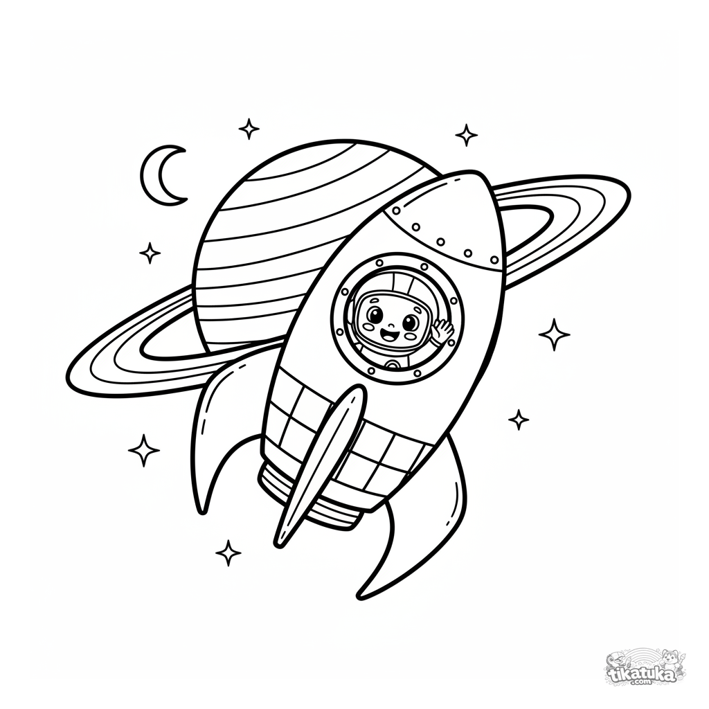 Página para colorir para crianças de 4-6 anos: um foguete retrô estilo anos 50 orbita um planeta anelado contra um fundo estrelado. Detalhes equilibrados, contornos claros.
