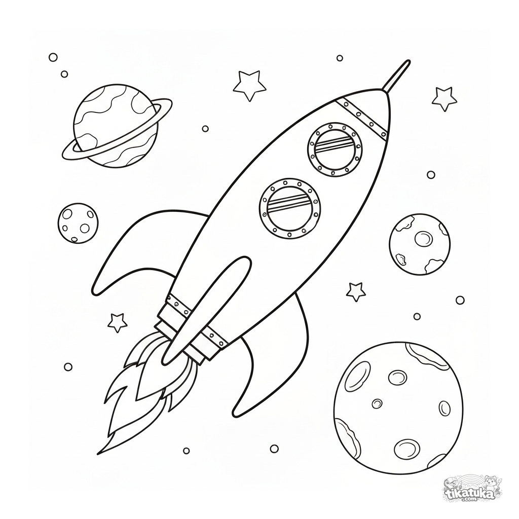 Página para colorir de um foguete retrô estilo anos 50 flutuando entre planetas e estrelas em um fundo branco. Para crianças de 5 a 8 anos. Formas simples com margens amplas para colorir.