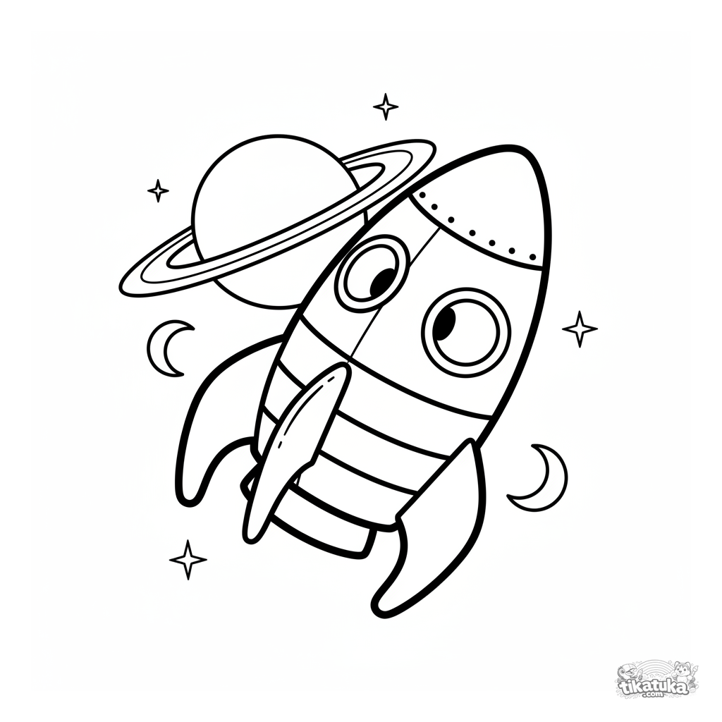 Página para colorir simples de um foguete retrô estilo anos 50 flutuando no espaço perto de um planeta anelado. Para crianças de 2 a 5 anos.