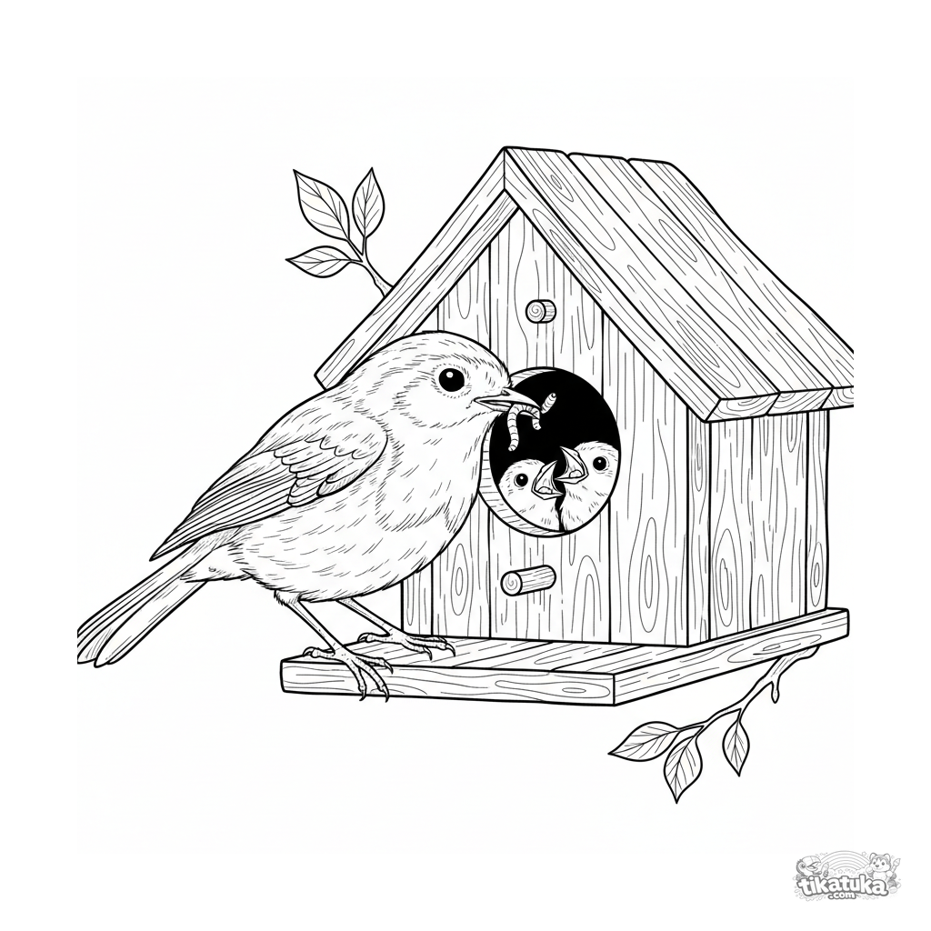 Página para colorir realista complexa para crianças mais velhas de 10 a 12 anos: um pisco-de-peito-ruivo entregando uma minhoca a seus filhotes em uma casa de pássaros de madeira.