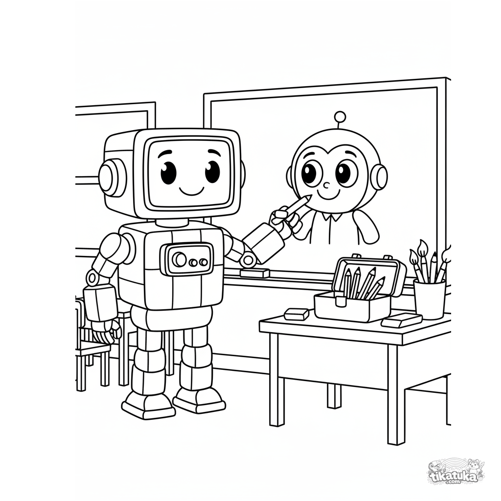 Página para colorir: um robô professor de arte desenha um personagem de desenho animado no quadro da sala. Para crianças de 4 a 6 anos. Detalhes: caneta, caixa de ferramentas, pincéis.