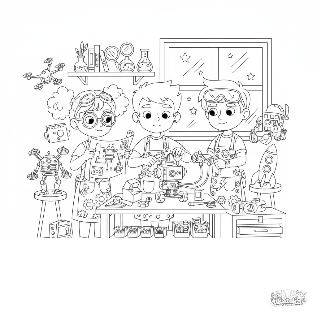 Página para colorir dinâmica estilo quadrinhos-aventura: uma equipe de amigos construindo um robô em um porão hacker. Muitas ferramentas, peças e poses expressivas para 10-12 anos.