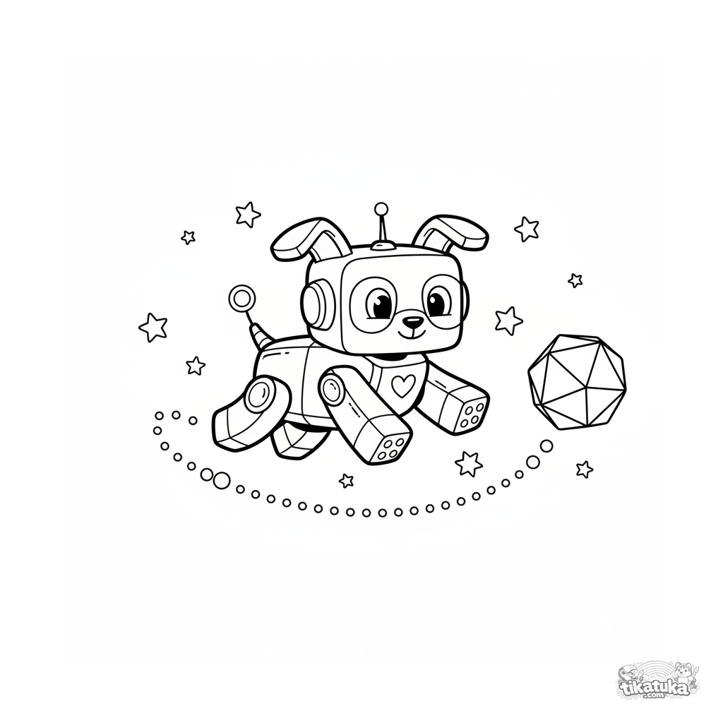 Página para colorir para 2-3 anos: um cão robô amigável pula entre estrelas no espaço sideral, brincando com um orbe brilhante. Formas grandes e simples.