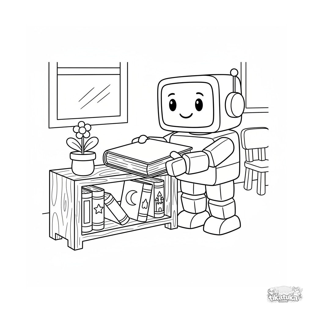 Página para colorir para crianças de 7-9 anos: um robô bibliotecário organiza livros em uma prateleira em uma sala de aula. Detalhes do interior, robô amigável.