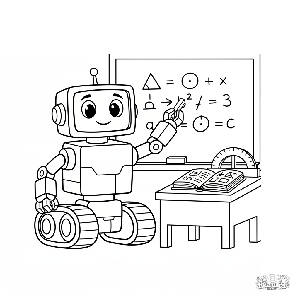 Página para colorir para crianças 7-9: um robô tutor amigável escreve uma equação geométrica no quadro da escola na sala de aula, livros didáticos por perto.
