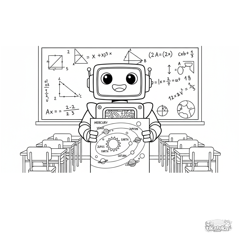 Página para colorir para crianças mais velhas 10-12: um robô estudante apresenta um projeto de ciências sobre o sistema solar no quadro da sala de aula.