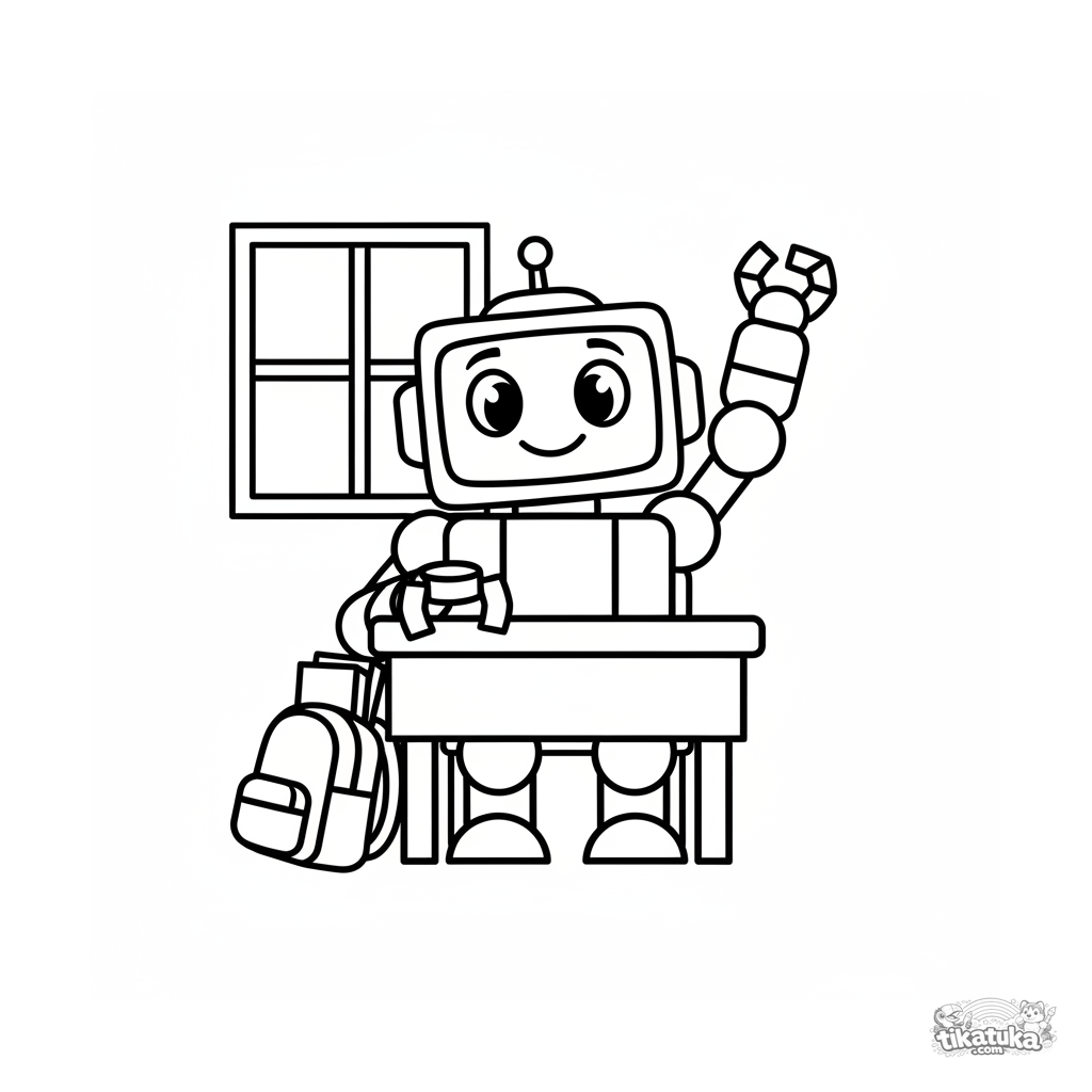 Página para colorir simples para crianças pequenas 2-3: um robô estudante senta-se na carteira e levanta a mão.