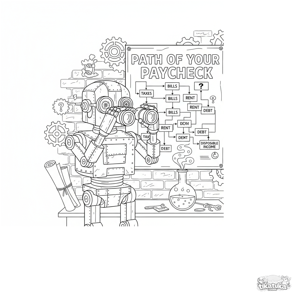 Página para colorir para crianças 10-12: um robô vintage com monóculo e binóculos complexos estuda um diagrama confuso 'Caminho do seu Salário' em um laboratório.