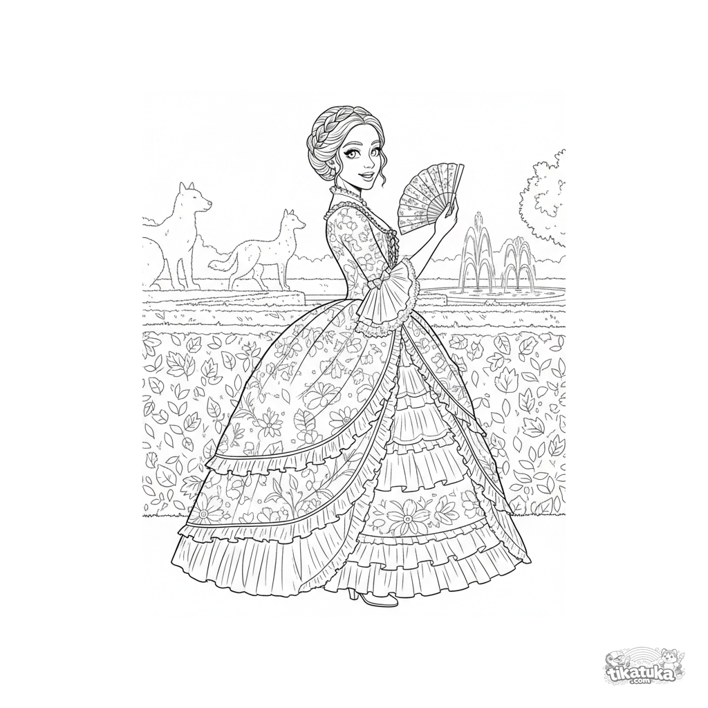 Página complexa para colorir para meninas 10-12 anos: vestido histórico estilo rococó em um labirinto de jardim. Babados em camadas, fundo detalhado.