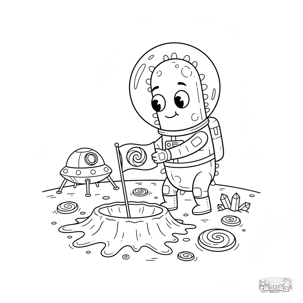Página para colorir para crianças de 7 a 9 anos: uma bactéria astronauta explora uma cratera em um planeta pirulito. Uma imagem educativa e cativante de um micróbio em estilo de divulgação científica.