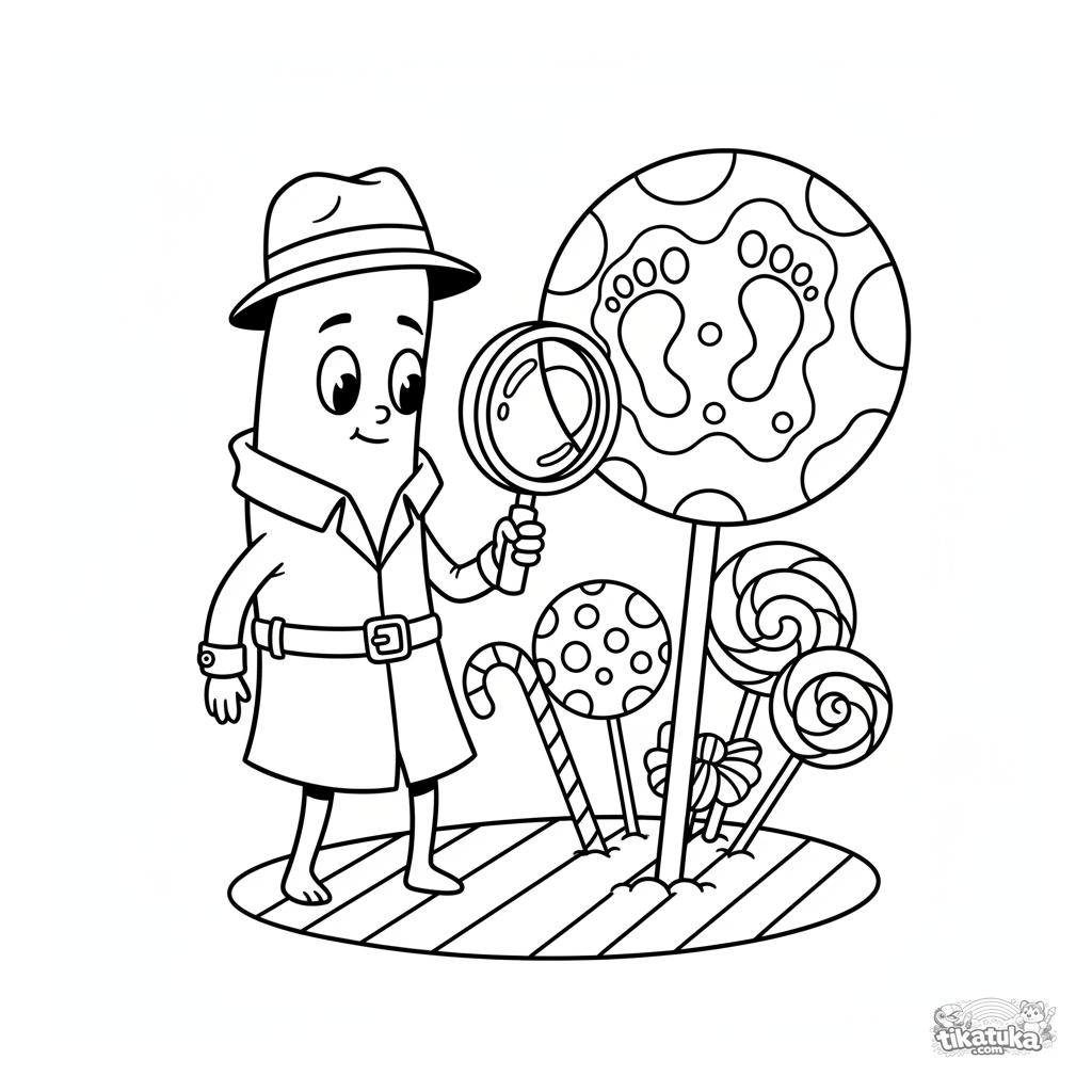Página para colorir para crianças 7-9: uma bactéria bastonete em estilo anos 90, vestida de detetive, investiga num pirulito. Cena engraçada com elemento de mistério.