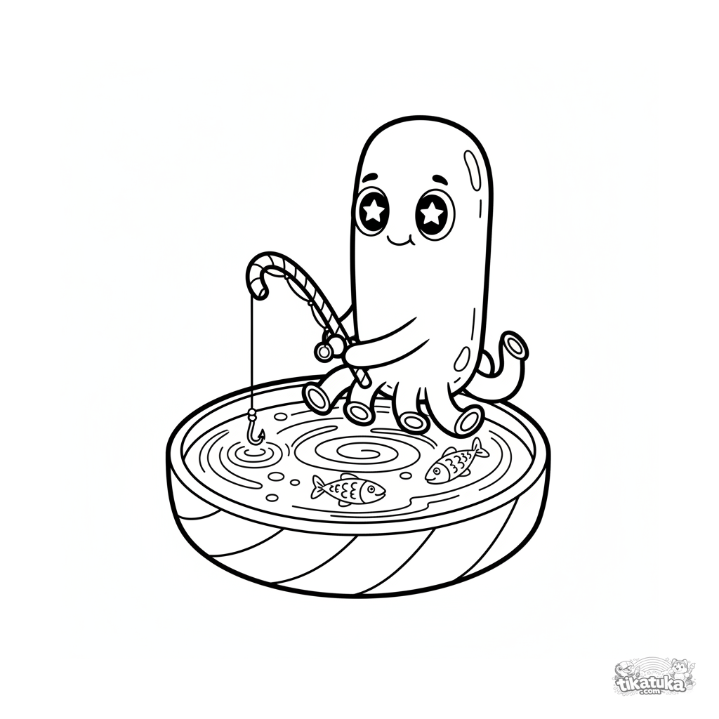 Página para colorir simples para bebês 2-3 anos: uma bactéria bastonete amigável com vara de pescar sentada na borda de um pirulito. Formas grandes, poucos detalhes, margens amplas.
