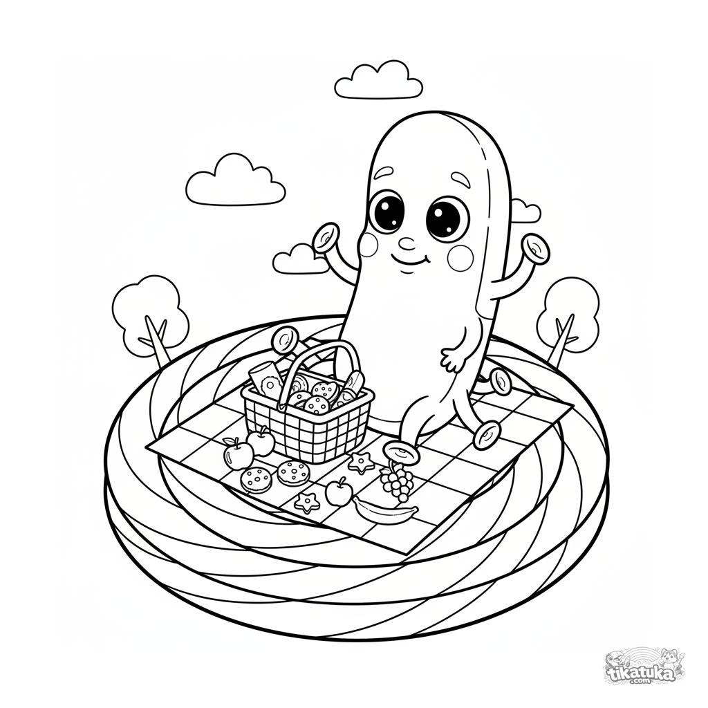 Página para colorir para crianças de 4-6 anos: uma bactéria bastão amigável faz um piquenique em um cobertor sobre um pirulito. Estilo de boneco de pano macio.