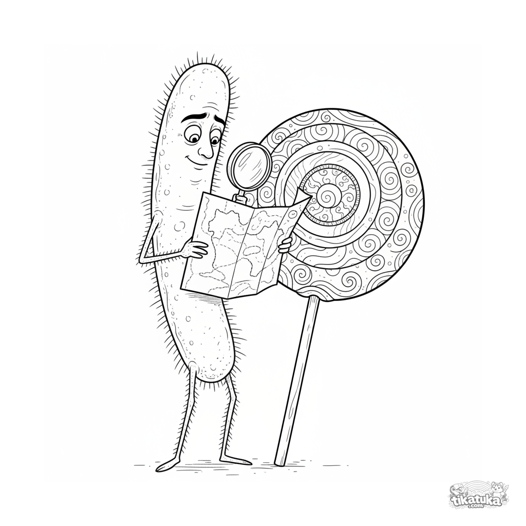 Página detalhada para colorir para crianças mais velhas 10-12: uma bactéria topógrafa com um mapa estuda os padrões de um pirulito gigante. Estilo de ilustração científica.