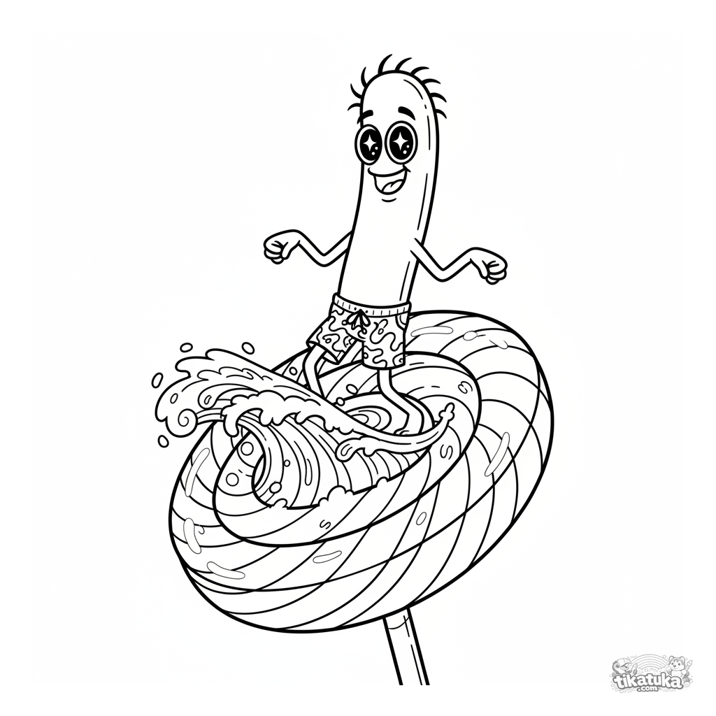 Página detalhada para colorir para crianças maiores de 10-12 anos: uma bactéria em forma de bastão de sunga pegando uma onda de açúcar num pirulito arco-íris. Cena dinâmica, alto detalhe.