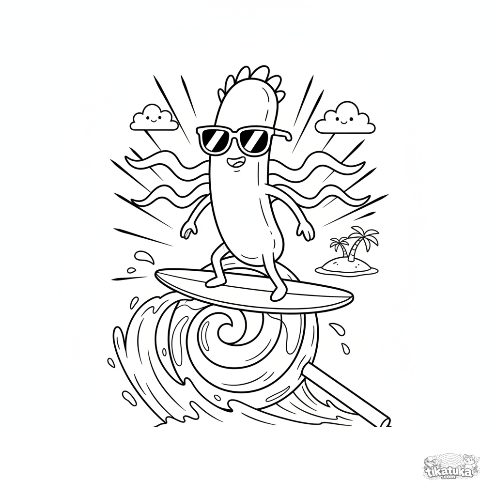 Página para colorir para crianças 7-9: uma bactéria em forma de bastão com óculos de sol surf habilmente numa onda feita de pirulito. Cena de ação dinâmica.