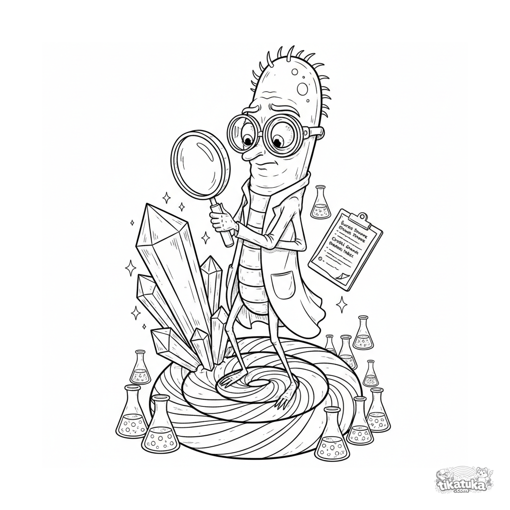 Página realista detalhada para colorir para crianças 10-12: um micróbio cientista em forma de bastão com óculos e jaleco estuda cristais de açúcar num pirulito. Cena em estilo guia de campo.
