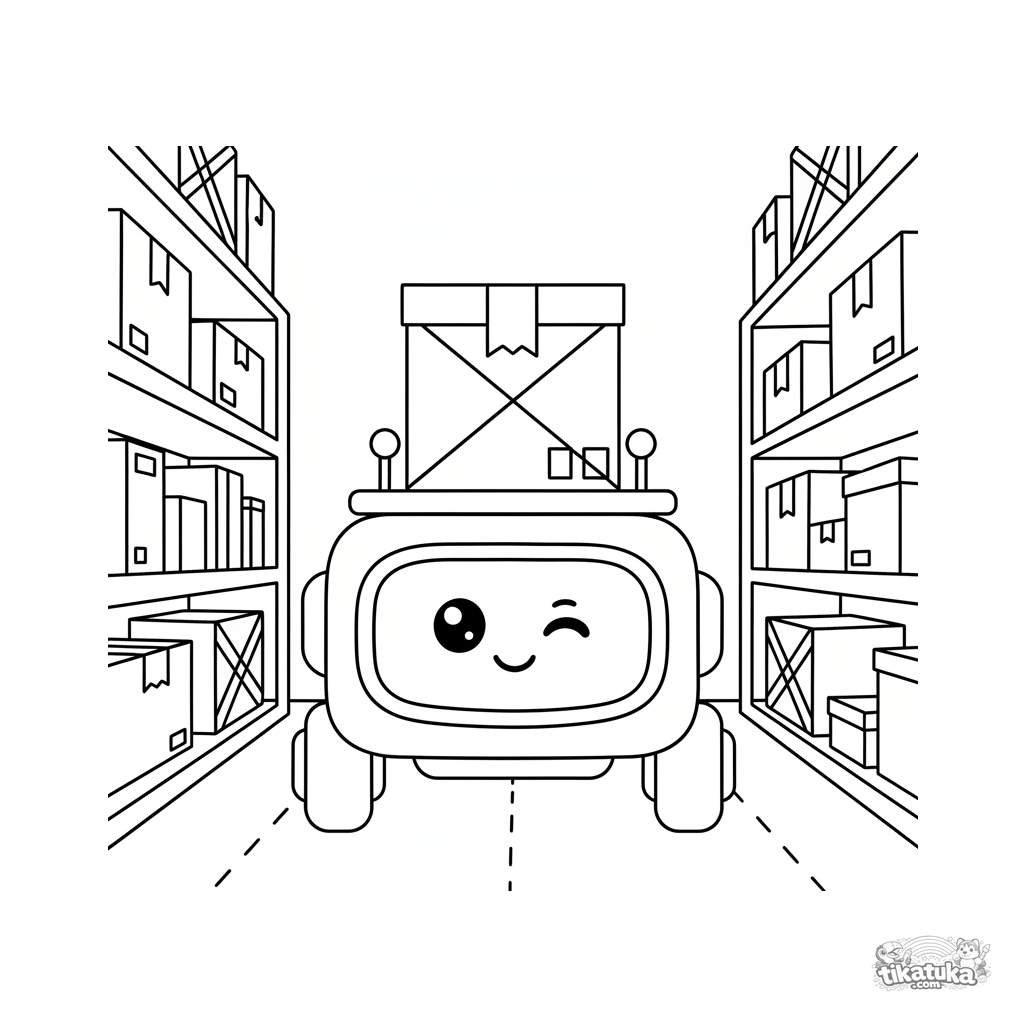 Página para colorir para crianças 4-6: um robô de entrega com cúpula sobre três rodas carrega uma caixa por um corredor estreito entre prateleiras altas de armazém. Formas planas limpas, rosto amigável no display.