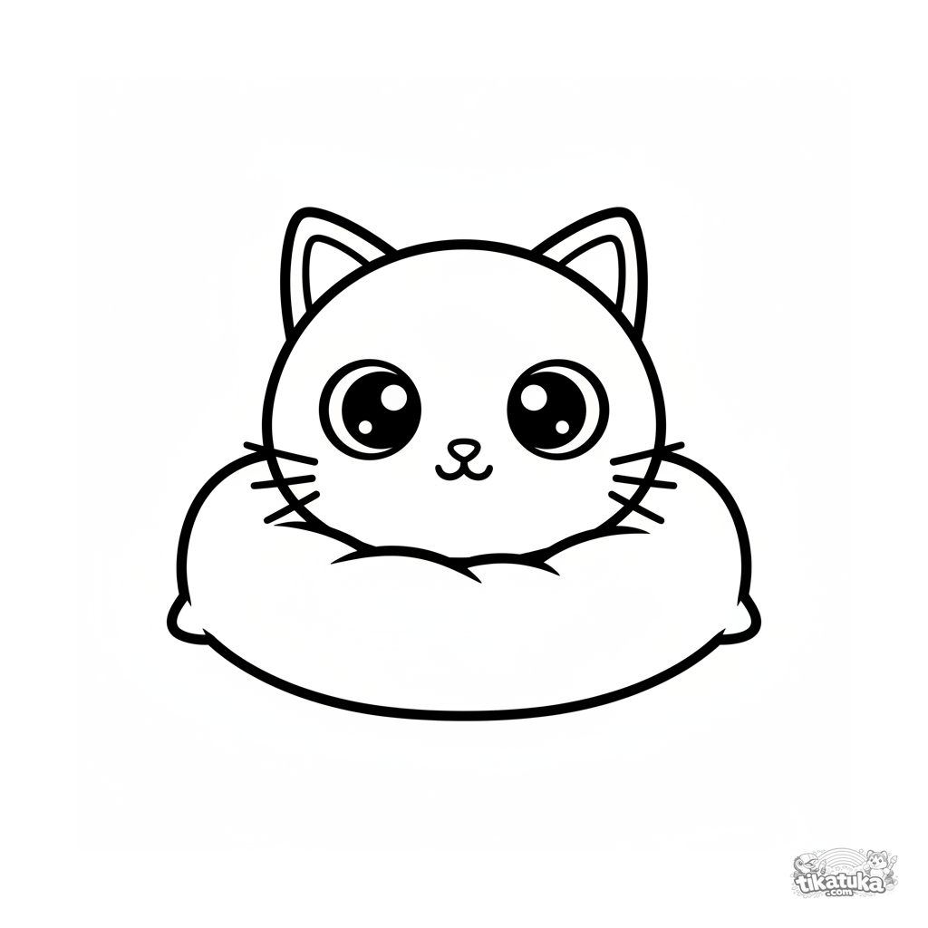 Página para colorir super simples para crianças de 2 anos: um rosto redondo e sorridente de gato em uma almofada. Olhos enormes, linhas simples.