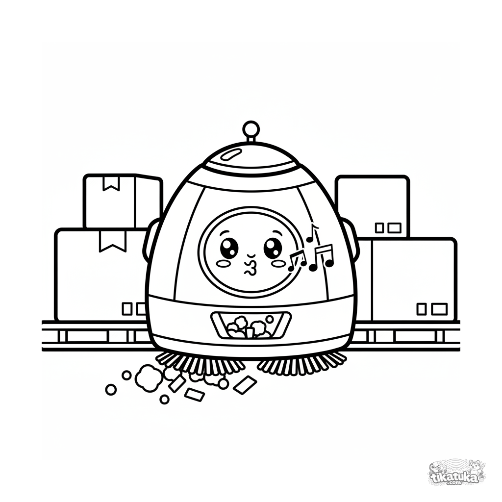 Página simples para colorir de um robô zelador redondo varrendo o chão do armazém. Para crianças pequenas de 2 a 3 anos.